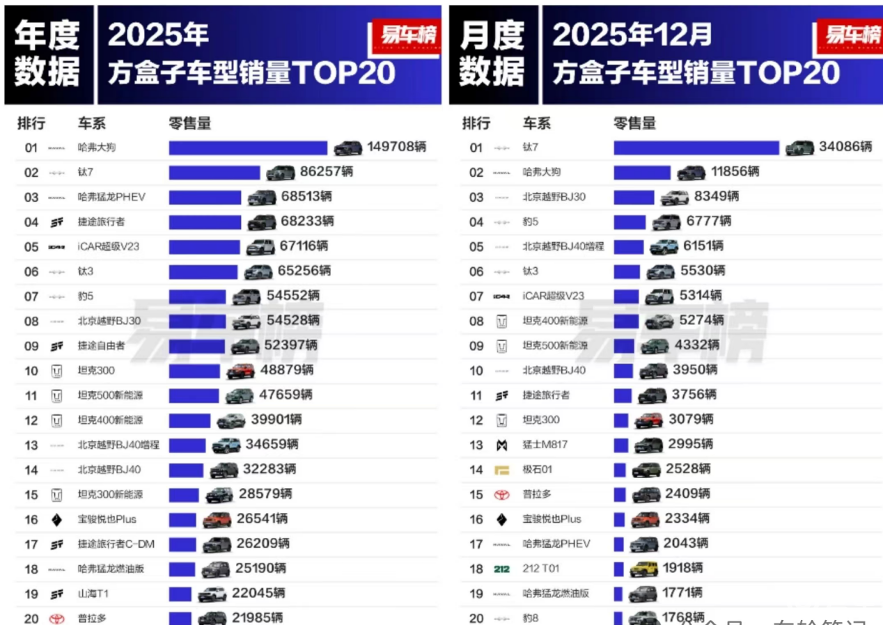 这个判断在十年后得到了验证。2025年,方盒子SUV销量突破102万台,新能源占比超过30%,同比增长209%。方盒子不再是少数越野爱好者的“周末玩具”,而是正在成为越来越多家庭用户的“全场景座驾”。