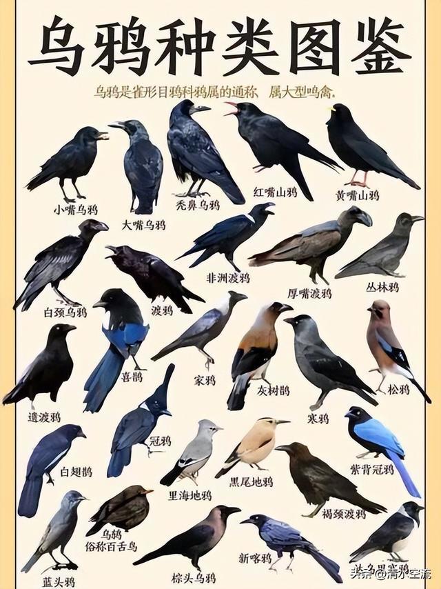 乌鸦属于鸦属,目前已知共有46个种,57个亚种。乌鸦是中大型鸟类 ,体长一般在40~70厘米之间,喙为纯黑色,鼻孔完全被硬直的鼻须遮盖;体羽多为黑色或黑白相间,黑色羽毛通常带有紫蓝色的金属光泽;翅长于尾,尾端呈凸状;腿与脚呈纯黑色。
