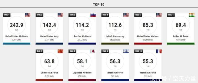 这个所谓的“世界现代军用飞机名录”网站,每年都会更新一份这样的榜单,今年的排名和去年基本没什么变化,美国海陆空三军及海军陆战队,依然作为四个独立主体,且全部挤进全球前五。